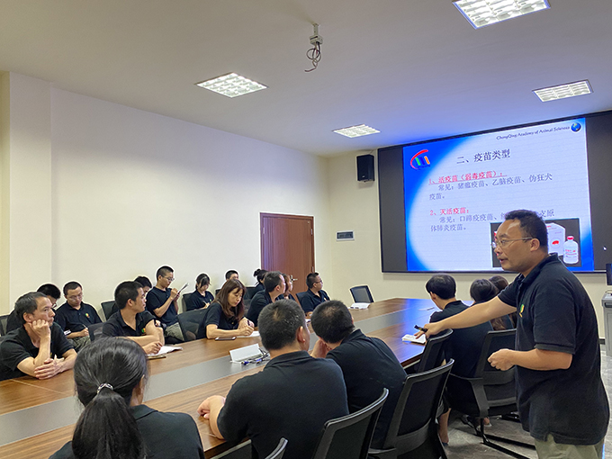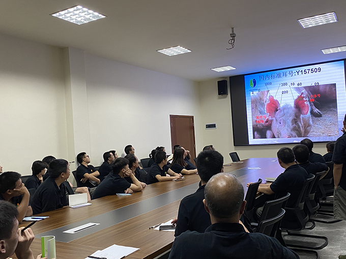 培訓會上,基地場長邱進杰就疫苗的分類、運輸、管理和使用,肌肉注射技術,國家通用標準耳缺識別方法等方面進行了全面、細致的講解。特別對疫苗保存、稀釋和使用方法,注射針頭的合理選擇、注射部位科學確認等方面的操作技術及注意事項作了重點介紹。基地技術指導、生物安全專家羅宗剛博士對培訓內容有針對性地作補充和總結,并提出了相關管理要求。培訓會上,參訓員工還就國際通用耳缺識別方法等方面進行了互動和現場模擬識別,培訓達到了良好的預期效果。
