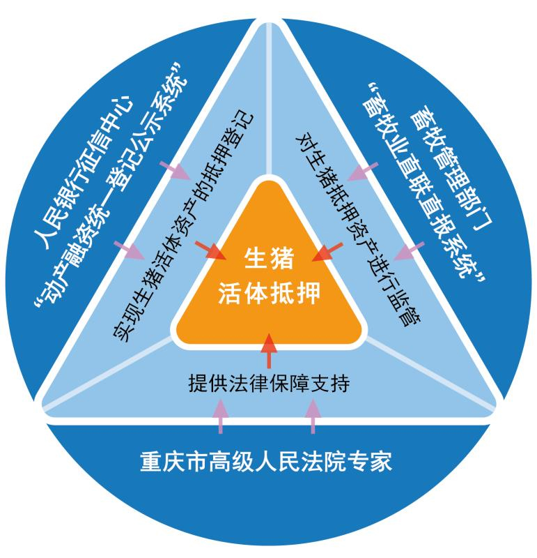 在黔江、涪陵、榮昌三地試點(diǎn),探索數(shù)據(jù)賦能,解決生豬活體抵押貸款不能貸難題。利用人民銀行征信中心的“動(dòng)產(chǎn)融資統(tǒng)一登記公示系統(tǒng)”大數(shù)據(jù),實(shí)現(xiàn)生豬活體資產(chǎn)的抵押登記,并出具有效證明文件。利用畜牧管理部門“畜牧業(yè)直聯(lián)直報(bào)系統(tǒng)”大數(shù)據(jù),對(duì)生豬抵押資產(chǎn)存出欄數(shù)、防疫檢驗(yàn)、市場價(jià)格等情況進(jìn)行監(jiān)管,并定期、不定期向貸款銀行反饋,幫助承貸銀行控制抵押生豬資產(chǎn)風(fēng)險(xiǎn)。重慶市高級(jí)人民法院專家對(duì)生豬活體抵押的效力進(jìn)行解讀,為數(shù)據(jù)賦能提供法律保障。