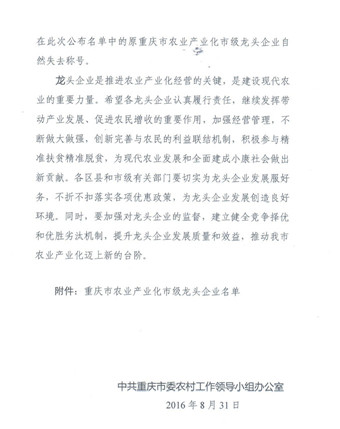 根據《重慶市農業產業化市級龍頭企業申報認定與監測管理辦法(試行) 》(渝委農工組辦〔2011〕7號)規定,市農委組織開展了2016年農業產業化市級龍頭企業申報及監測工作。在區縣和市級有關部門審核上報、有資質中介機構評審基礎上,經研究并向社會公示,決定認定重慶六九畜牧科技股份有限公司為重慶市農業產業化市級龍頭企業。