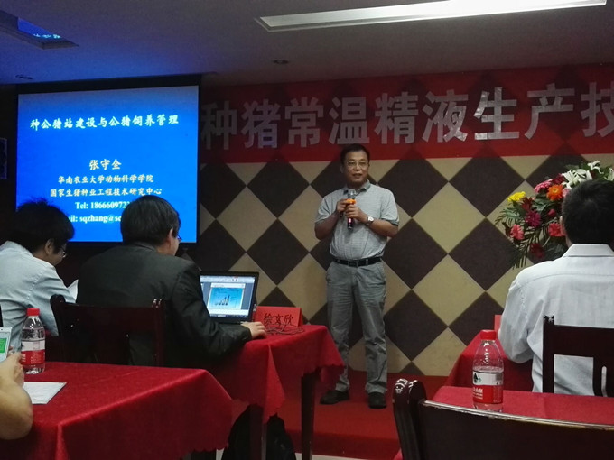本次培訓班邀請了德國minitube公司專家、張勤教授、張守全教授、徐文欣、倪德斌教授等國內外知名專家教授從種公豬站的建設管理、公豬的飼養管理、種公豬站的疾病防控等方面進行培訓,講解示范采精與原精質量檢驗、常溫精液生產、常溫精液質量檢測、人工授精技術的實踐操作。