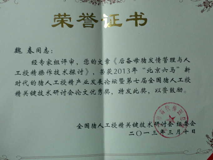 本屆研討會上,我場撰寫的兩篇論文被組委會論文集收錄,其中技術(shù)員魏春撰寫的《后備母豬發(fā)情管理與人工授精操作技術(shù)探討》獲得了優(yōu)秀論文獎(jiǎng)。