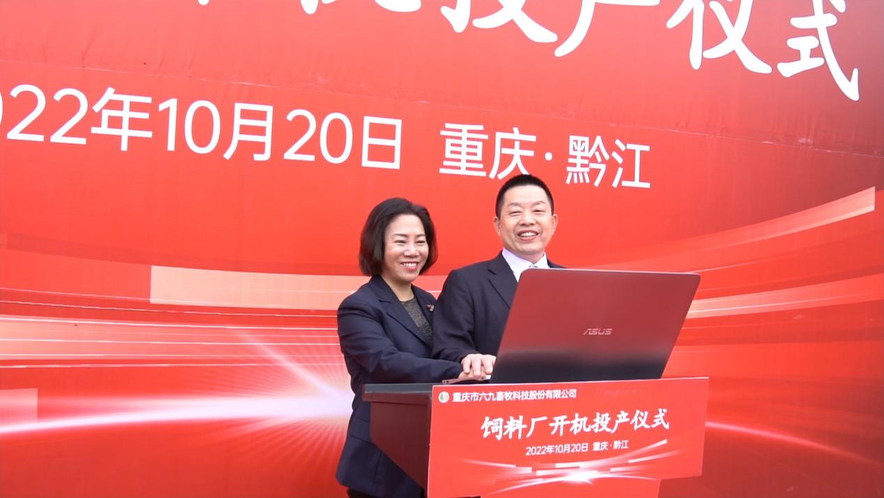 隨后,69畜牧總經理羅云宣布正式投產開機,攜手董事長王藜線上一鍵開機啟動生產設備開始投產。
