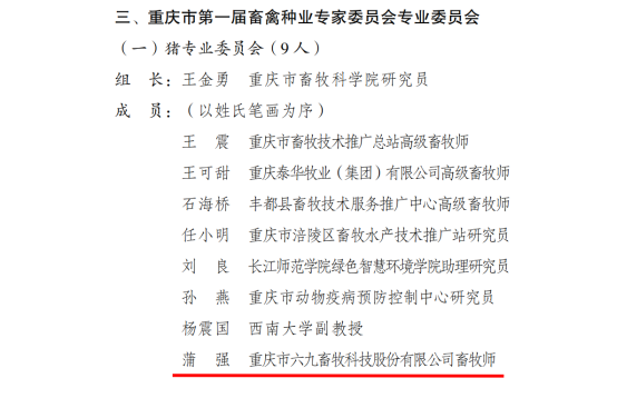 重慶市第一屆畜禽種業專家委員會正式成立,重慶市六九畜牧科技股份有限公司副總經理蒲強同志入選重慶市第一屆畜禽種業專家委員會豬專業委員會成員。蒲強也是唯一一位工作在民營企業的豬專業委員會成員。