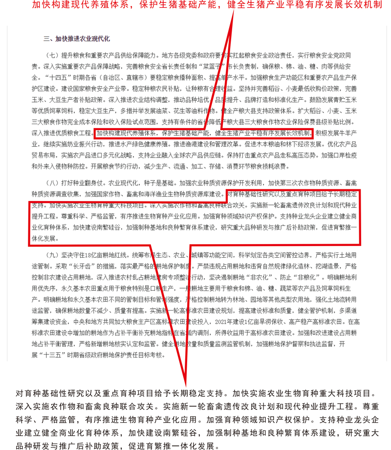 《中共中央 國務院關于全面推進鄉村振興加快農業農村現代化的意見》提出:加快構建現代養殖體系,保護生豬基礎產能,健全生豬產業平穩有序發展長效機制,積極發展牛羊產業,繼續實施奶業振興行動,推進水產綠色健康養殖。